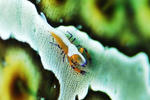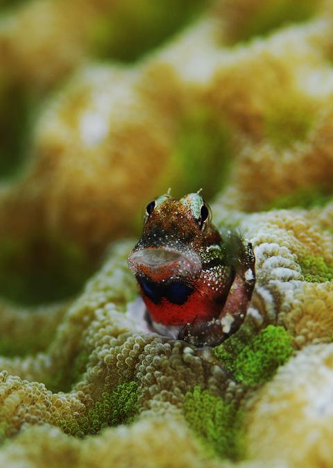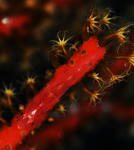 赤いサンゴの上にハゼが乗ってます♪  まわりのお花はポリープと言いますが・・・